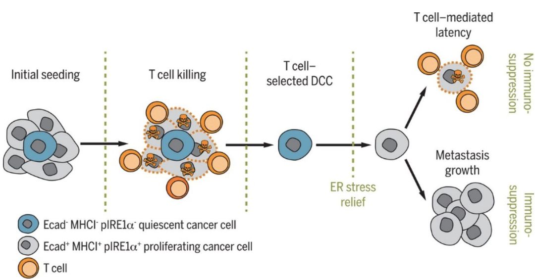 在这项研究中,科学家们发现,在小鼠中扩散的胰腺导管癌细胞,大部分都会被免疫系统揪出来清理掉,只有很少数的癌细胞,会启动一种叫做未折叠蛋白反应(unfolded protein response,UPR)的模式,从而进入不活跃的休眠状态,同时也减少自己表面一些特征分子的表达,长得不再像坏细胞了,就能逃过免疫细胞的法网,在某个旮旯潜伏起来。等到有一天,科学家们出手抑制了小鼠癌细胞里这种促休眠的未折叠蛋白反应,并削弱小鼠免疫系统的时候,这些躲过了前一波免疫系统大清洗的休眠癌细胞就可能有机会苏醒过来,再度进入活跃的生长期(图3)。