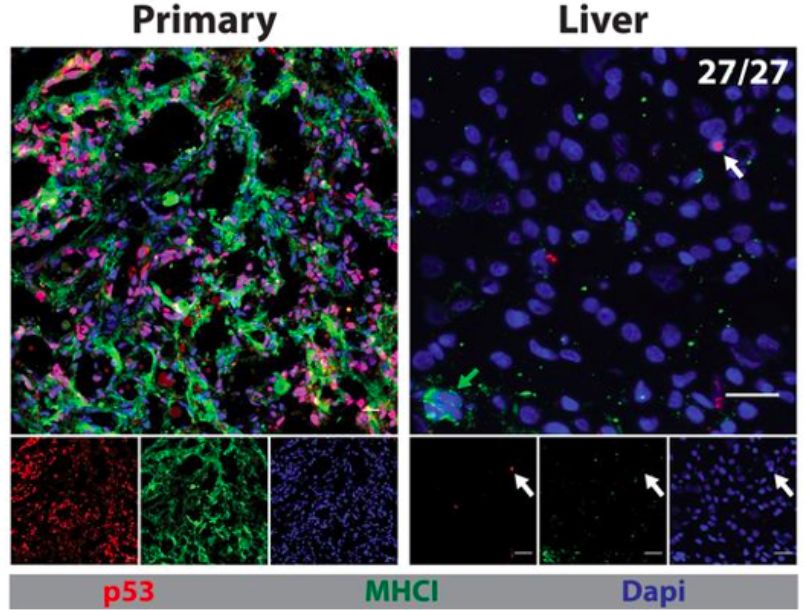 举个例子呢,2018年六月的 Science 杂志上,就有一项针对休眠癌细胞的研究[8]。在未发现转移病灶的胰腺导管癌患者的肝组织样本里,研究人员检测到了少量的扩散的癌细胞(图2)。随后,他们在胰腺导管癌的小鼠模型里,也同样地在健康的肝部发现了少量的癌细胞。