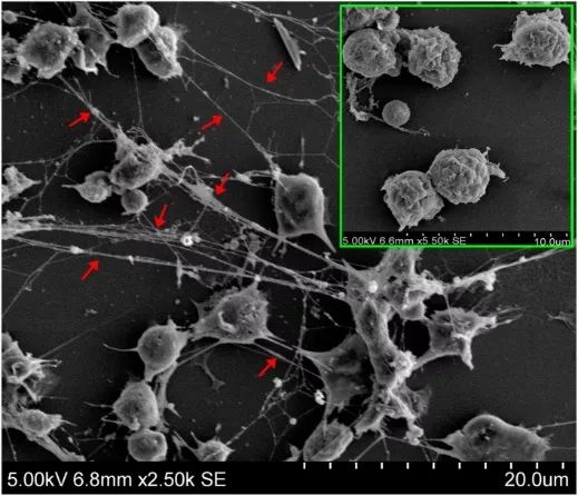 图4. 嗜中性粒细胞胞外陷阱NET,在电镜下看,就是图5里红箭头指出的那些网状结构:[10]