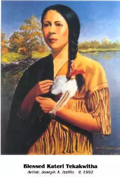 卡特蕾圣女,她的塑像展示在四座美国的天主教教堂内