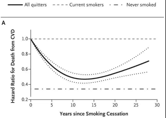 戒烟年数与心血管疾病死亡的关系,横轴为戒烟年数,纵轴为死亡率
