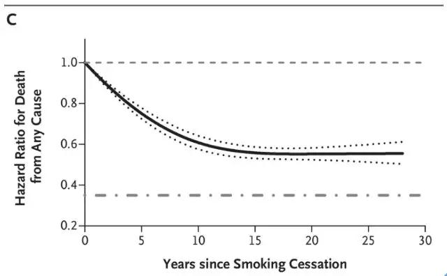 戒烟年数与全因死亡风险的关系,横轴为戒烟年数,纵轴为死亡率
