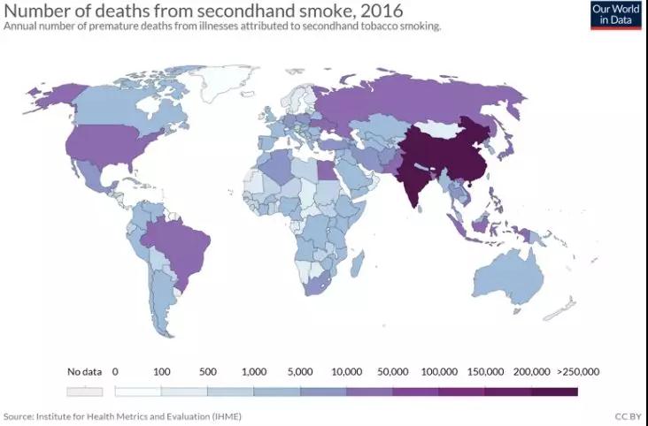 2016年,全球二手烟致死人数分布 (来源:https://ourworldindata.org/smoking)
