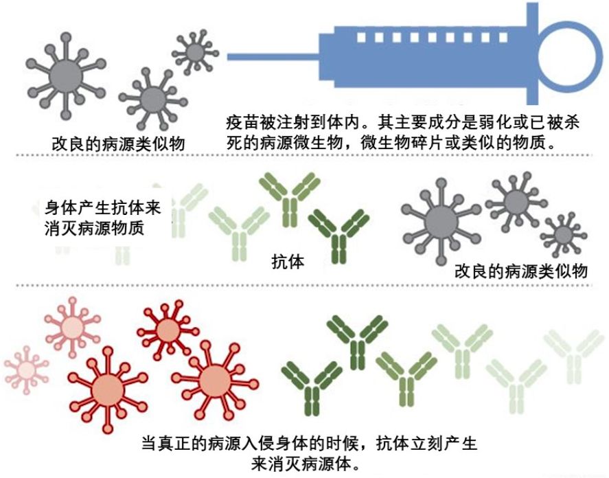 疫苗通常的成分是弱化版本的或已被杀死的病源微生物,以及微生物碎片或类似的物质。接种疫苗时,这些物质进入体内,免疫系统被激活,同时也会记住它。等到以后和疫苗长得非常像的病源微生物入侵体内的时候,免疫系统的“记忆“功能就会被激活,防御比第一次更快更强大,有效杀死病源,防止人生病。