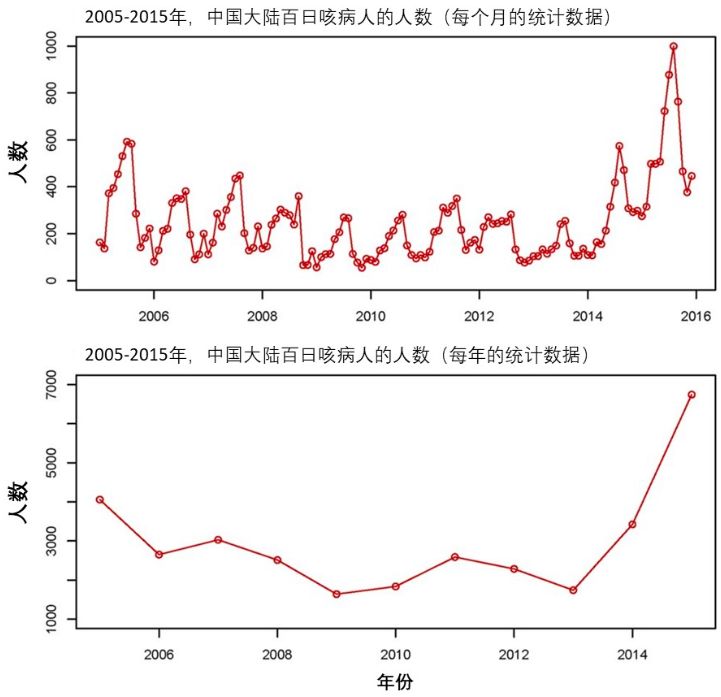 2005-2015年中国的百日咳发病人数。图片来源:参考文献[2],经作者修改。