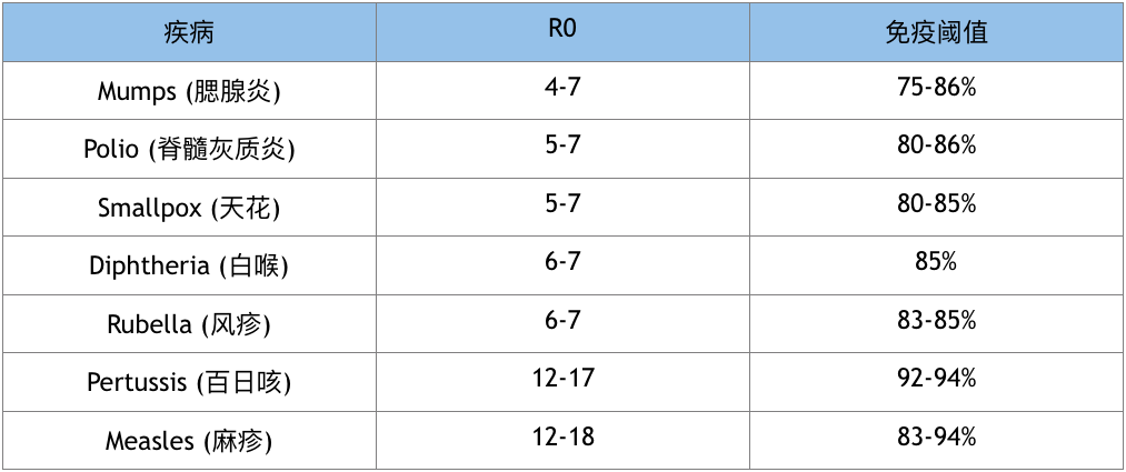 除了考虑R0值,计算免疫阈值还要考虑其他许多复杂的因素:针对特定疾病的疫苗的有效性;接种疫苗或者曾经感染疾病以后产生的免疫能力可以持续多久——因为很多免疫力会随着时间流逝而减弱,所以有些疫苗需要定期打加强针;哪些特殊的群体是疾病传播链中最关键的链结等等。综合考虑这些因素,才能最后设定免疫阈值,下表就列出了几个疾病的R0和免疫阈值: