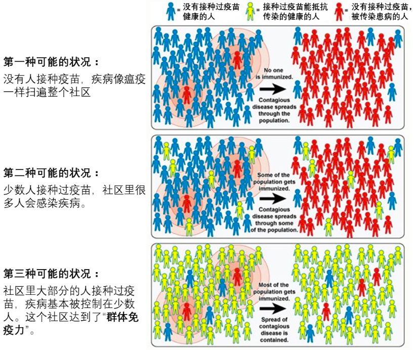 要解释这个问题,就要提到一个学术词汇:群体免疫力(herd protection)。群体免疫力是一种保护整个社区免受疾病侵害的手段:通过免疫社区里足够多的人,从而有效地打断疾病从一个人传染到另一个人的接力,中断感染链,从而保护少数不能接种疫苗的人群。但是,这个模式要真正起作用,社区中接种疫苗的人必须足够多。接种疫苗的人数必须高于一个最小的百分值(学术界称之为“阈值”),群体免疫才会生效。接种的社区成员越多,整个社区就越能够避免疾病的爆发。