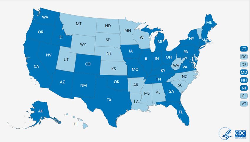 从2019年1月1日至7月18日,已在美国30个州确认了1,148例个体麻疹病例。较深的蓝色代表有确认麻疹病例的州。图片来源:CDC ;日期:7/22/2019