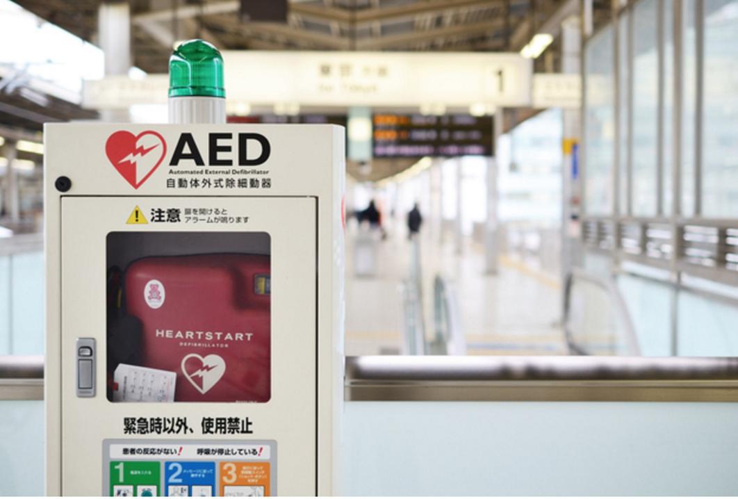 设置于日本某车站的AED设备。日本规定,在一天人流量过万的车站,都需要设置AED。 图片来源:日本国营铁路官网