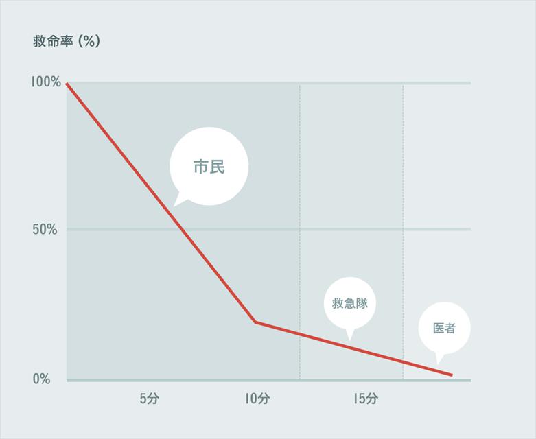 图为发生心脏骤停后的获救率变化。越早给予处理,生存率会越高,所以普通市民具有一定急救知识是十分必要的。