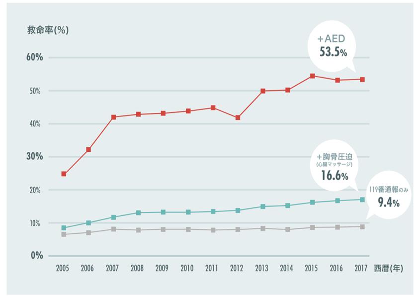 AED可以大幅提高病患的生存几率。图片来源:日本総務省消防厅