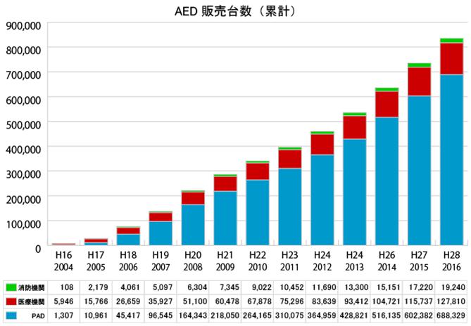 从2004年开始,日本的AED累计贩卖数显著增加 (PAD:公共场所等一般市民也可以接触使用的地方)。