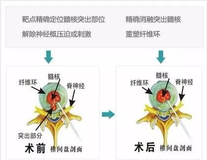 局麻下即可进行,主要针对椎间盘三层纤维环最外层的纤维环尚完整的患者,将直径约为3mm的射频头插入到椎间盘内,利用等离子射频将髓核的一部分气化溶解后,降低椎间盘内的压力,进而使突出的髓核能有一定程度的回缩,缓解压迫解决症状。