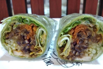 取食品保险膜铺于案板上,将之前洗净备用的时蔬基底,可根据喜好任意选择,搭配自制的牛肉酱一起卷入菠菜饼中,用保鲜膜密封好,吃时从中间切开即可。
