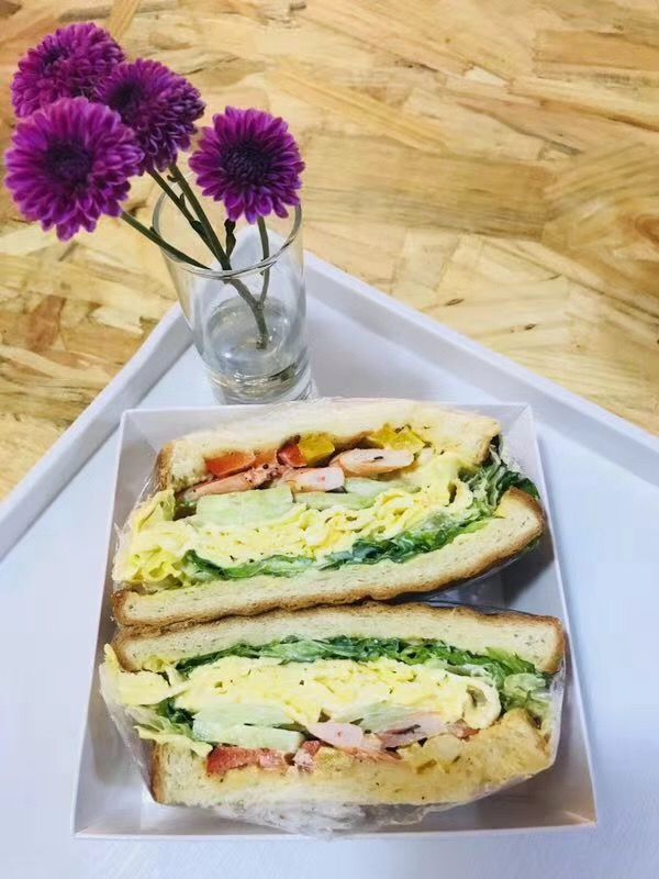 最后用保鲜膜将三明治密封好,吃时从中间切开即可。