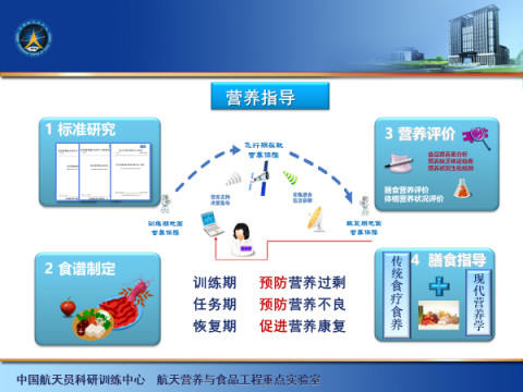 航天营养保障遵循“训练期预防营养过剩,飞行期预防营养不良,后恢复期促进营养康复”的指导思想。