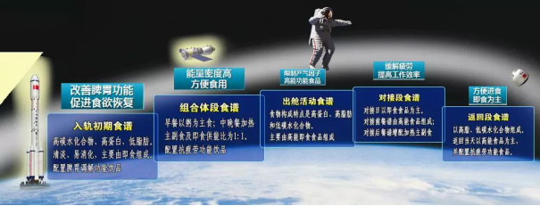 飞行食谱按入轨初期、交会对接段、组合体飞行段、出舱活动段和返回段等不同任务特点和飞行乘组个人的习惯喜好进行了区别设计,经过航天飞行试验验证,保障了历次载人飞行任务的圆满完成。