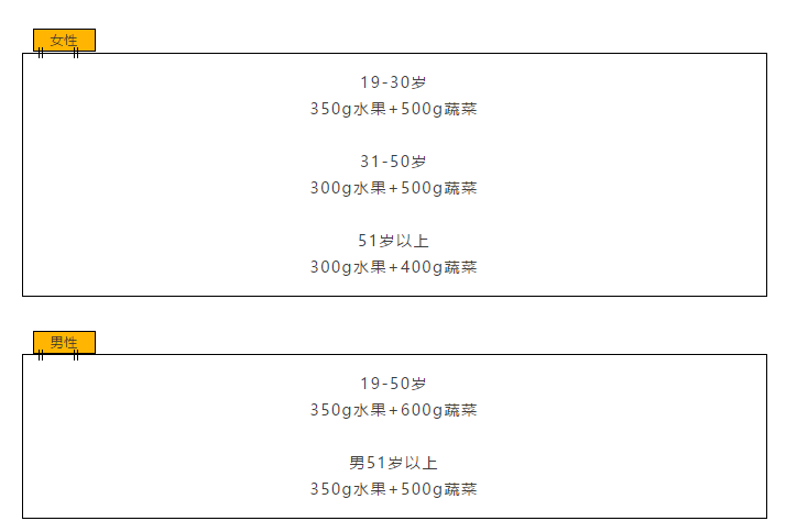 根据中国居民膳食平衡宝塔2016版的推荐,成年人每天蔬菜摄入量需要达到300-500g,水果200-350g。