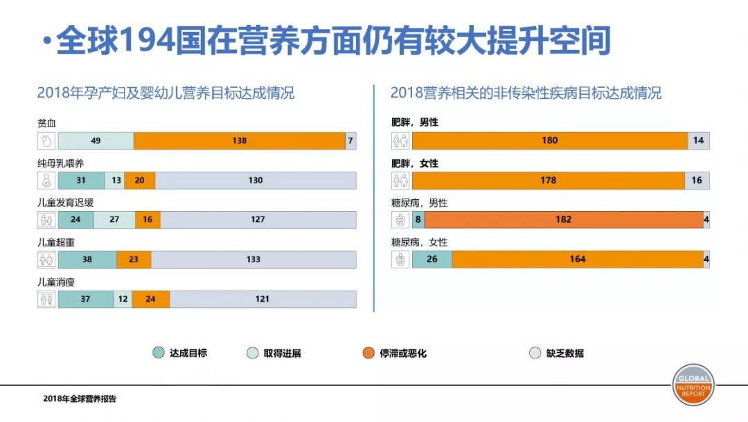最新版《全球营养报告》在2018年底发布,《报告》指出全球范围内有多项指标还需要进一步改善,其中包括成人肥胖、超重、糖尿病、贫血、儿童发育迟缓、儿童消瘦、儿童超重和纯母乳喂养问题。