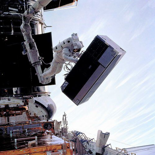 宇航员在第二次哈勃望远镜维修任务中正在移除高分辨率光谱仪
