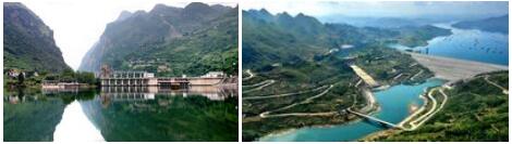红水河是华南大河——珠江水系西江上游的干流,其上源南盘江在贵州省蔗香与北盘江汇合后称红水河。而红水河干流在广西石龙三江口与柳江汇合后又称黔江。它们被合称为南盘江红水河水电基地。作为中国规划装机容量第七大的水电基地,南盘江红水河流域可以通过以下数据得到准确的宏观描述:南盘江全长927千米,总落差1854米,流域面积54900平方千米,其中天生桥至纳贡段河长仅18.4千米,集中落差达184米。红水河全长659千米,落差254米,流域面积131000平方千米。