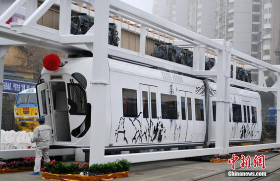 这列我国自主研制完成的新能源空铁列车,车身为卡通的熊猫图案,共两节车厢,每节车厢定员70人,时速最高可达65公里,它以纯蓄电池为动力、永磁电机驱动,集成了5项成熟机车先进技术、4项创新型专有技术和16项专利,能够实现精准控制、全线无人驾驶。