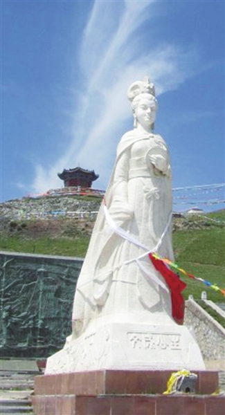 作为华夏的子孙,当我站在日月山上,仿佛能够看见公主远去的背影,如今这里,山还是那座山,只是山更青,草更绿,朝拜的游人如织。今天的日山和月山上各修建了两座亭子,分别叫日亭和月亭,经幡飘舞的亭子里面用碑文和壁画记录了公主入藏时的种种情景。山上是无数藏人用虔诚和信仰堆起的玛尼堆,石堆上插满了盘树虬枝。山下是文成公主庙,矗立着巍峨的文成公主汉白玉雕像。