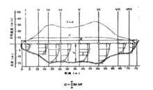 ⑤同理,用求积仪或数方格法量出河床线与水面线包围的面积,经比例尺换算后得断面面积F。则断面平均流速: