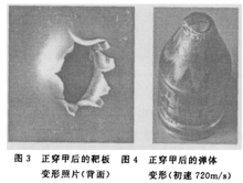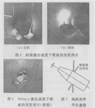 为撞击倾角。即高斜角撞击情况下,靶板为花瓣型破坏,其中前方的花瓣向后,后边的花瓣向前,如图7所示。在文中的弹靶构形中,45°斜撞击为高倾角撞击。从实验结果来看,在高速撞击时,实验与他们的分析是一致的;而在低速撞击时,二者是不一致的。