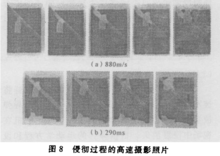 图8为290m/s和880m/s撞击速度下弹体45°斜侵彻靶板的高速摄影照片。由图可见,弹体在高速撞击时其方向没有发生明显的改变,与Ziad等的分析中所考虑的相似;而在低速撞击时弹体发生明显的偏转现象,从而导致侵彻过程中的倾角减小,导致靶板发生与高速撞击时不同的失效模式。