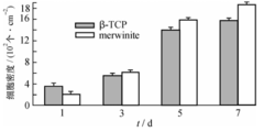 在材料表面进行细胞培养是判断材料细胞毒性和相容性的主要手段之一,为其体内实验提供前期依据。研究采用经成骨诱导的大鼠成骨细胞为种子细胞,与镁蔷薇辉石和β-TCP材料进行体外复合培养,分析细胞在材料上的粘附、增殖、分化的情况。