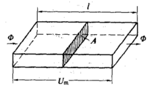 图示一段磁路。它有均匀长方形截面,磁感应线和截面垂直。令截面上的磁通量是Φ,磁路两端的磁位差是Um,则这段磁路的磁阻Rm定义为