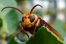 大胡蜂,Vespula vulgaris (Linnaeus),胡蜂科黄胡蜂属的一种昆虫。是一种分布广泛、种类繁多、飞翔迅速的昆虫。属膜翅目之胡蜂科,雌蜂身上有一根有力的长螫针,在遇到攻击或不友善干扰时,会群起攻击,可以致被攻击动物出现过敏反应和毒性反应,严重者可导致死亡。黄蜂通常用浸软的似纸浆般的木浆造巢,食取动物性或植物性食物。