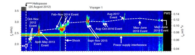 [2] Gurnett, D. A. and Kurth W. S. Plasma densities near and beyond the heliopause from the Voyager 1 and 2 plasma wave instruments. Nature Astronomy (2019)