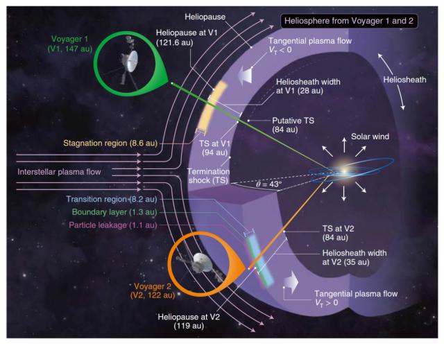太阳带领整个太阳系在银河系中运动,在与星际物质迎面相遇的那一侧,日球层顶距离太阳的距离约为一百多个天文单位(AU),也就是地球与太阳之间距离的100多倍(1天文单位=日地平均距离)。作为人类目前飞的最远的探测器,美国于1977年发射的旅行者1号与旅行者2号,在2012年8月和2018年11月分别完成了日球层顶的穿越。旅行者1号在地球轨道面(黄道面)以北的位置穿越日球层顶,穿越时与太阳的距离为121.7天文单位。旅行者2号则从黄道面以南穿越日球层顶,穿越时距离调养119.0天文单位。由于旅行者2号上的等离子体谱仪(PLS)依然能够正常工作,并没有像旅行者1号的PLS一样在上世纪八十年代就宣告罢工,科学家们对旅行者2号的星际穿越能够带来的科学发现寄予了更大的期望。