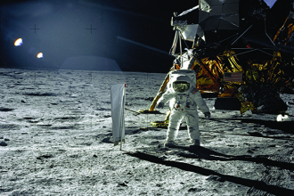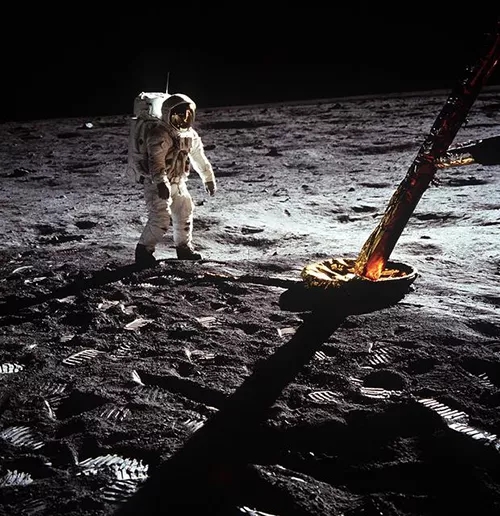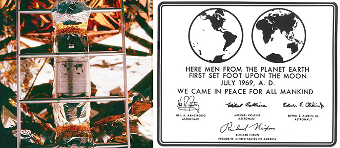 人员聚齐了,阿姆斯特朗和奥尔德林一同走到登月舱的前起落架前,那里放置着一块从地球带去的纪念匾。阿姆斯特朗郑重宣读:“1969年7月,来自地球的人类首次登上月球,我们是为全人类的福祉而来!”之后,这块纪念匾被留在月球上,见证着人类对月球的探索。