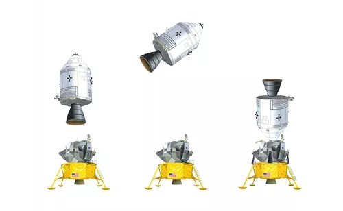 然而,对于整个任务来说,登月舱是必不可少的。于是,飞船便被安排在地月转移轨道上进行空中组装。这时,运行在轨道上的有土星五号火箭第三级以及尚未组装的阿波罗飞船。组装过程是这样的: