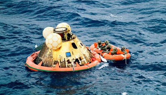 24日12时50分,阿波罗11号指令舱溅落在太平洋中部海面,三名航天员安全返回地球。这场奇妙的月球之旅终于落下帷幕。