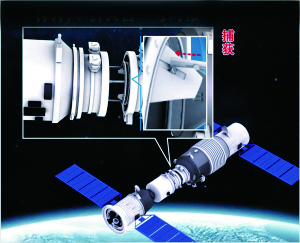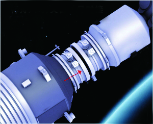 2)捕获。两个航天器碰撞,并接到失衡传感器发出对接指令信号后,神舟9号主动对接环的6根滚珠丝杆向外推出200毫米,对接环上的3把捕获锁与天宫1号对接环上相对应的3个卡板器咬合,被牢牢卡住,完成柔性连接(连接后仍能移动)。