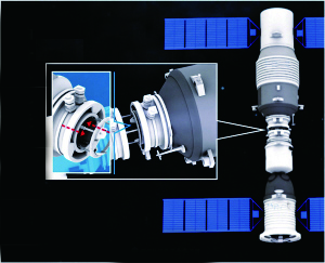 3)缓冲。神舟9号对接环受到撞击后,对接机构上的摩擦自动器和电磁阻尼器分别吸收纵向和横向撞击能量,进行缓冲,使其处于水平位置。碰撞、捕获、缓冲三个步骤需要的时间约60秒。