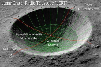 NASA喷气推进实验室的机器人技术专家Saptarshi Bandyopadhyay表示,要实现这一目标,需要将机器人送到月球的远端,并使用这些机器人在一个陨石坑上布置金属丝网,最终造出一个直径1公里的球形反射镜。