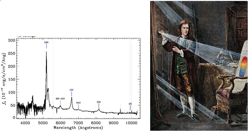 拍摄光谱,就像将光色散开来,展现在不同波长处的亮度分布。最直接的一个案例是三棱镜可以把太阳光色散成红橙黄绿蓝靛紫。同样,如果对类星体内一个点拍摄光谱,可以看到明显的发射线(图左)。同时,发射线之下可以拟合得到一条连续的辐射,叫做连续谱。目前我们认为,连续谱主要来源于黑洞周围的吸积盘。