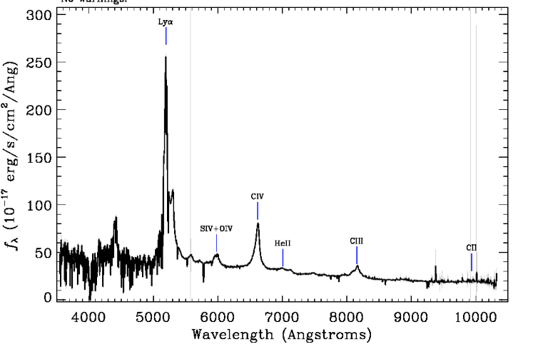 可是对于一个比较遥远的类星体,三根发射线线站成一排,它们发出的光的频率在红移。所以,对于距离我们110亿光年之外的类星体,可能小熊线就移到了近红外波段,而另外两根线又移到光学波段;而对于更遥远的黑洞(比如说我关心的119亿光年之外的黑洞),小熊线和小猪线都移到了近红外波段。
