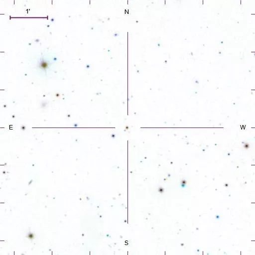 这张是它们在光学波段的图像。我关心的类星体是最中心的那个点,它看起来是不是很像一颗恒星?但它不是一颗恒星,也不是一个星系,而是一个活跃星系的中心。简单理解,它也是个黑洞,但是还在活跃地吃着东西,再加上有很强的质能转化效率,所以它能发出很强的光。