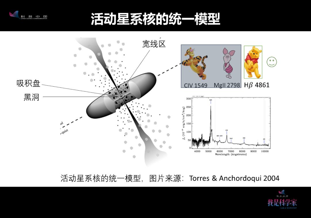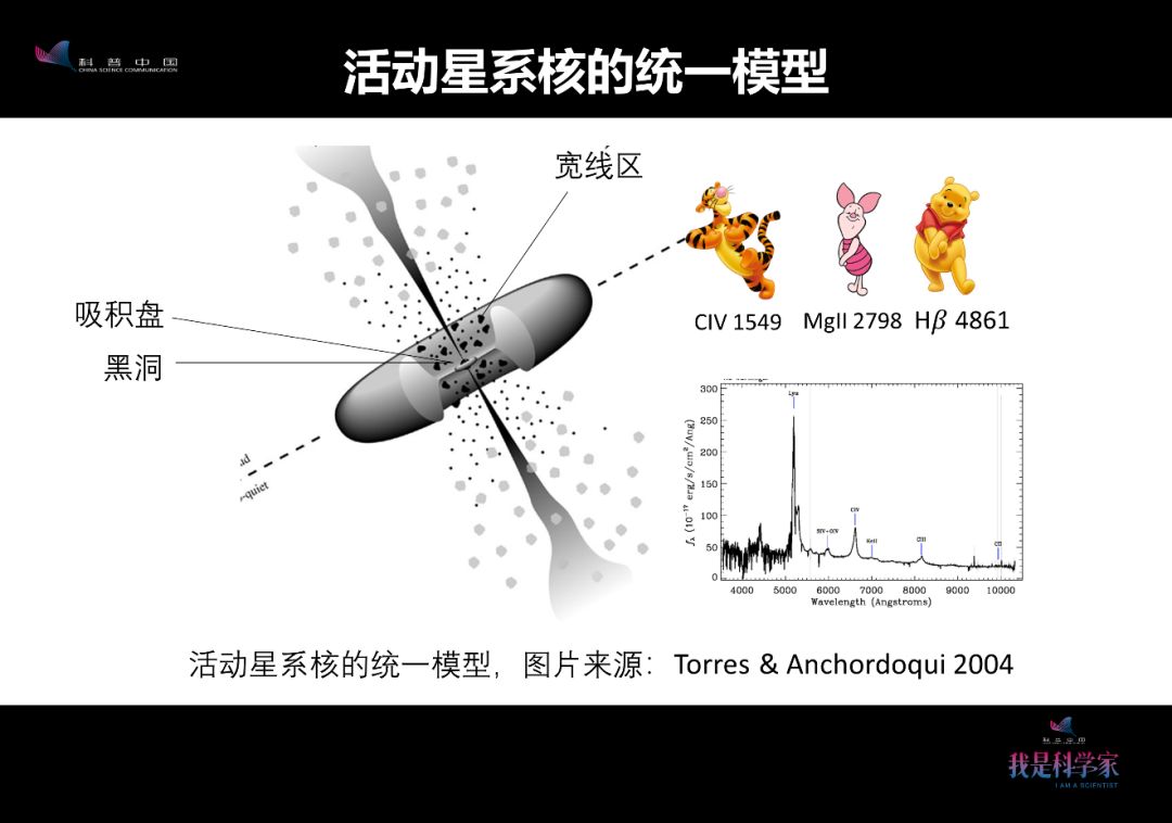 类星体是活动星系核,这张图展示的是活动星系核的一个简化的统一模型——我强调“简化”,因为其中很多细节还在研究当中。大家可以看一下,最中间那个点就是黑洞;黑洞外面还有一圈非常小的环,就是吸积盘。在吸积盘的外围上下方,大家能看到一些点状或者块状结构,我们认为是气体云块——你可以理解为是一团团气体在那里。距离黑洞比较近的那部分气体云块,我们称作为宽线区。