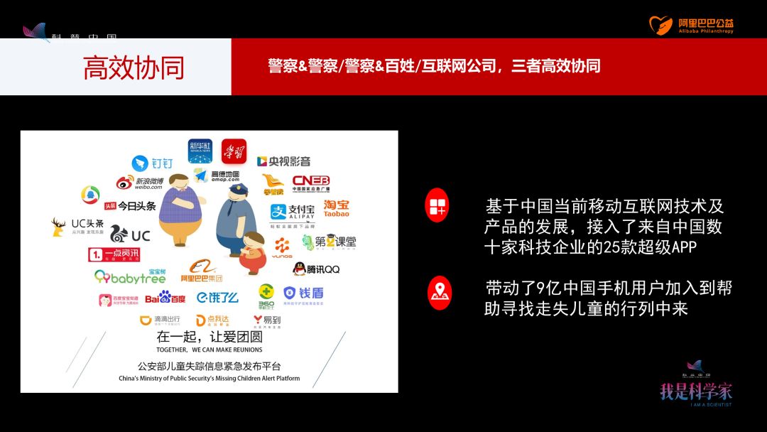 警察和民众的协同。用户接收到丢失儿童的信息后,如果恰好看见人贩子带着这个小孩经过,就会报警,警察就可以继续追踪,从而解救儿童。