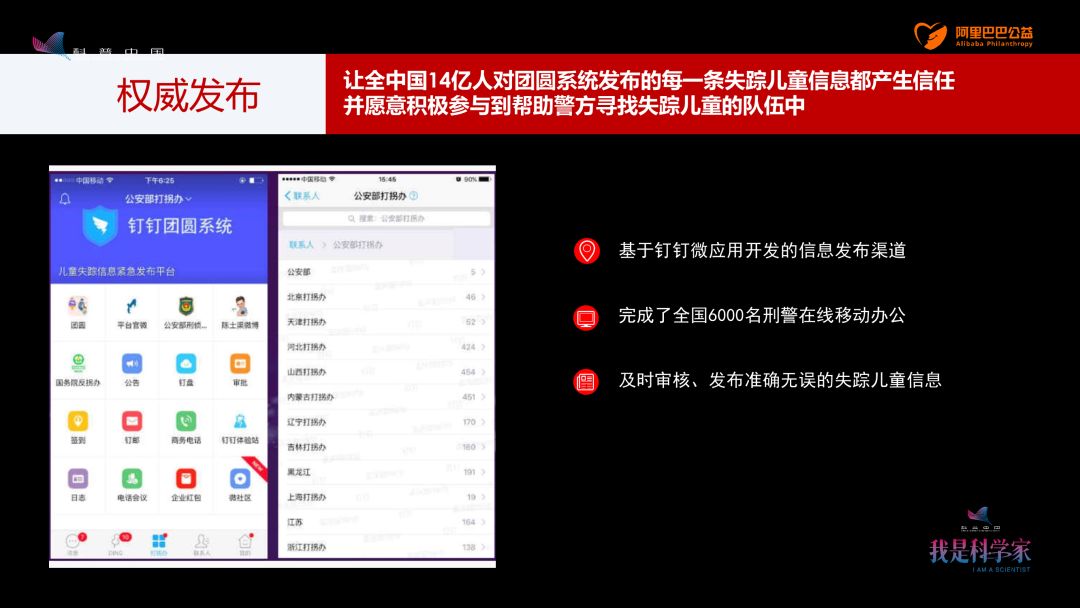 我们希望用户对团圆系统产生信任,从而实现全民持续参与。因此,系统发布的信息要百分之百准确,只允许打拐警察有发布走失消息的权限。全国有6000多名打拐警察,他们收到报警信息后,会从自己专业的角度判断信息是否是准确、全面。经过审核之后,警察会在钉钉开发的团圆系统上发布准确的消息(包括儿童的年龄、性别、照片,衣着外貌特征,以及丢失时间和位置)。