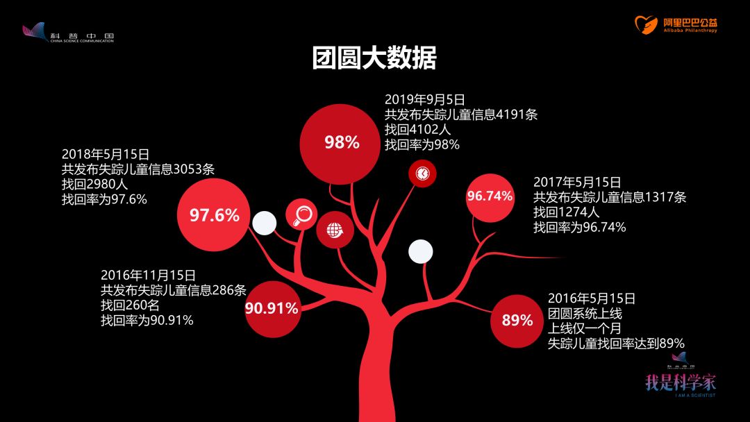 团圆系统在刚上线一个月的时候,儿童的找回率就已经达到了89%;上线半年的时候,找回率达到90.91%。根据最新的数据,截止今年9月5号,我们一共发布了4191条丢失儿童的信息,找回了4102人,找回率高达98%。