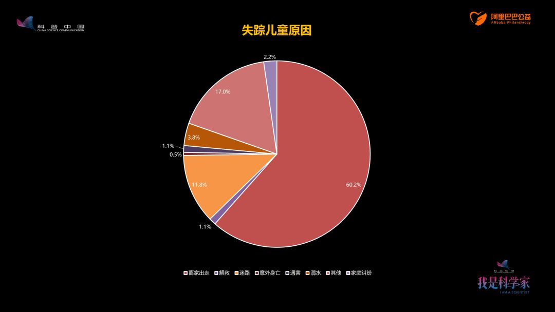 大家可能会觉得,失踪儿童的最大原因是被拐卖。实际上,从我们这些年统计的数据来看,最大的原因(60.2%)是离家出走。所以我们也希望给家长提醒一下,要学会更好地跟儿童沟通。