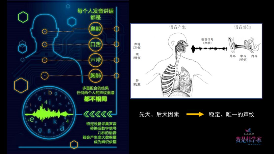 大家对指纹、掌纹、人脸、虹膜很熟悉,它们都属于生物特征,其实声纹也是一种生物特征。我们说话的时候,从胸肺开始,然后声带振动,通过咽喉,然后到口腔、鼻腔发出声来,其中还会用到舌头、牙齿、嘴唇。